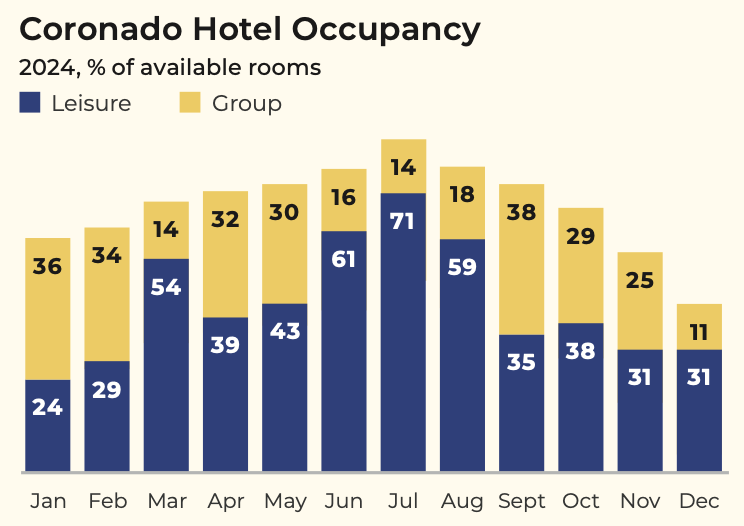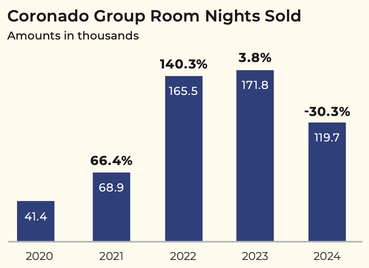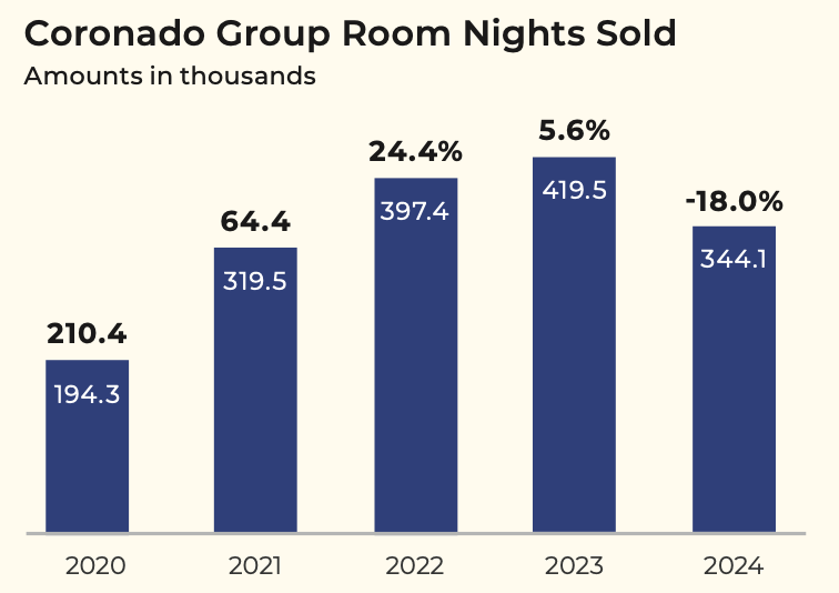 Group room nights declined 30.3% in 2024. Ongoing renovations by hotel properties in Coronado created supply constraints for group visitors to Coronado who often need large room blocks for events.