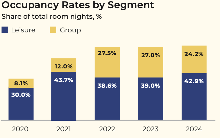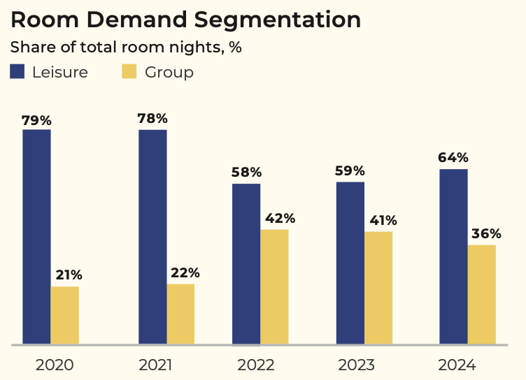 The share of group nights sold declined to 36% in 2024, the result of less hotel room inventory.