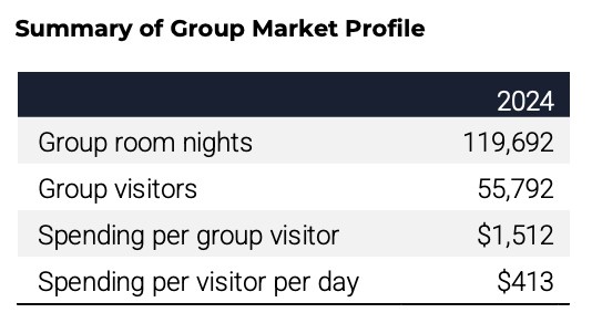 The 119,692 group room nights in 2024 generated $49.9 million in lodging spending and $84.3 million in total visitor spending. This includes visitor spending on transportation, restaurants, retail, recreation, and other services. Including the