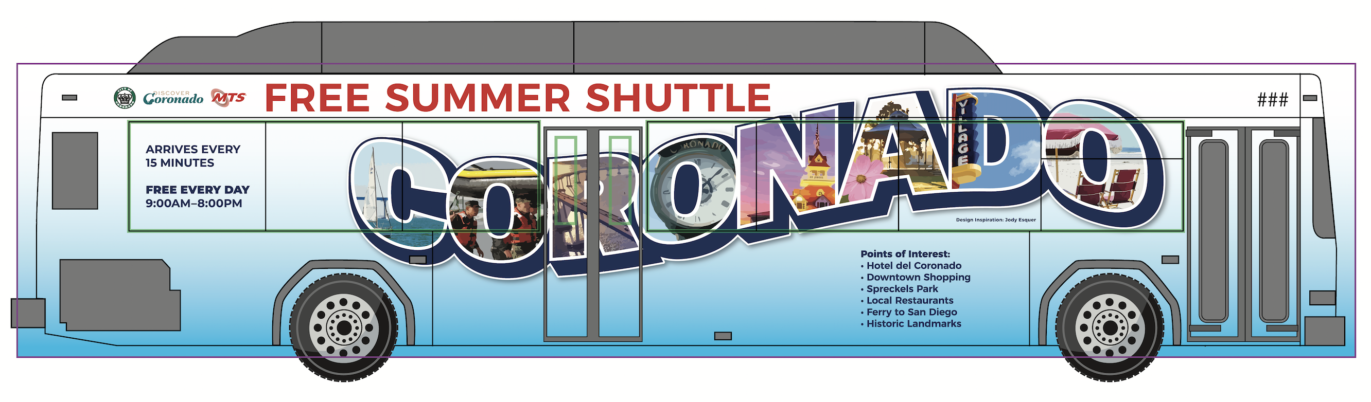 The Free Summer Shuttles reduce the need for cars and parking spaces across the island. It’s an easy way to see the many wonders on Coronado, including the beaches, the bays and all of the small businesses between them. Service runs 7 days a week from 9am to 8pm. They arrive every 15 minutes at bus stands. Each shuttle is air conditioned and they can carry baby strollers, surf boards, luggage and bikes. Service concludes Monday September 2.